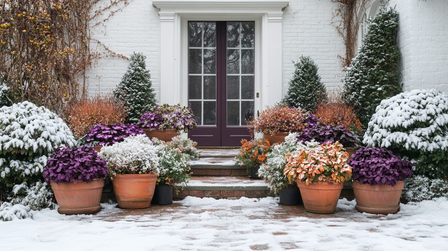 Professional display of winter container gardens with cold-hardy plants and insulation materials
