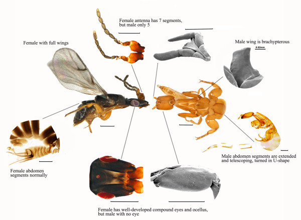 Comparison showing the extreme morphological differences between female and male fig wasps
